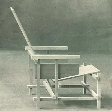 - La silla roja y azul, una versión posterior de su primera «Slat chair» de 1917, se caracteriza por una composición de planos y líneas, donde los elementos se prolongan más allá de sus uniones.